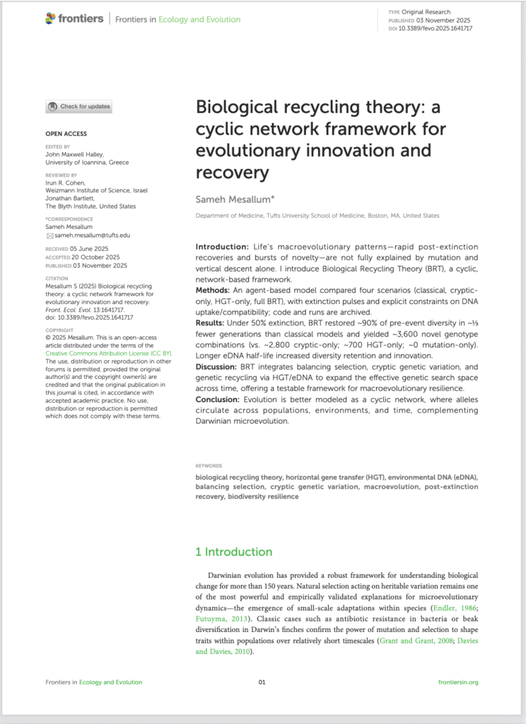 إن الأنماط التطورية الكبرى في الحياة — مثل التعافي السريع بعد أحداث الانقراض وظهور طفرات ابتكارية جديدة — لا يمكن تفسيرها بشكل كامل عبر الطفرات والوراثة الرأسية وحدها. ولهذا أقدّم نظرية إعادة التدوير البيولوجي (BRT)، وهي إطار شبكي-دوري يعتمد على حركة المورثات عبر الزمن.