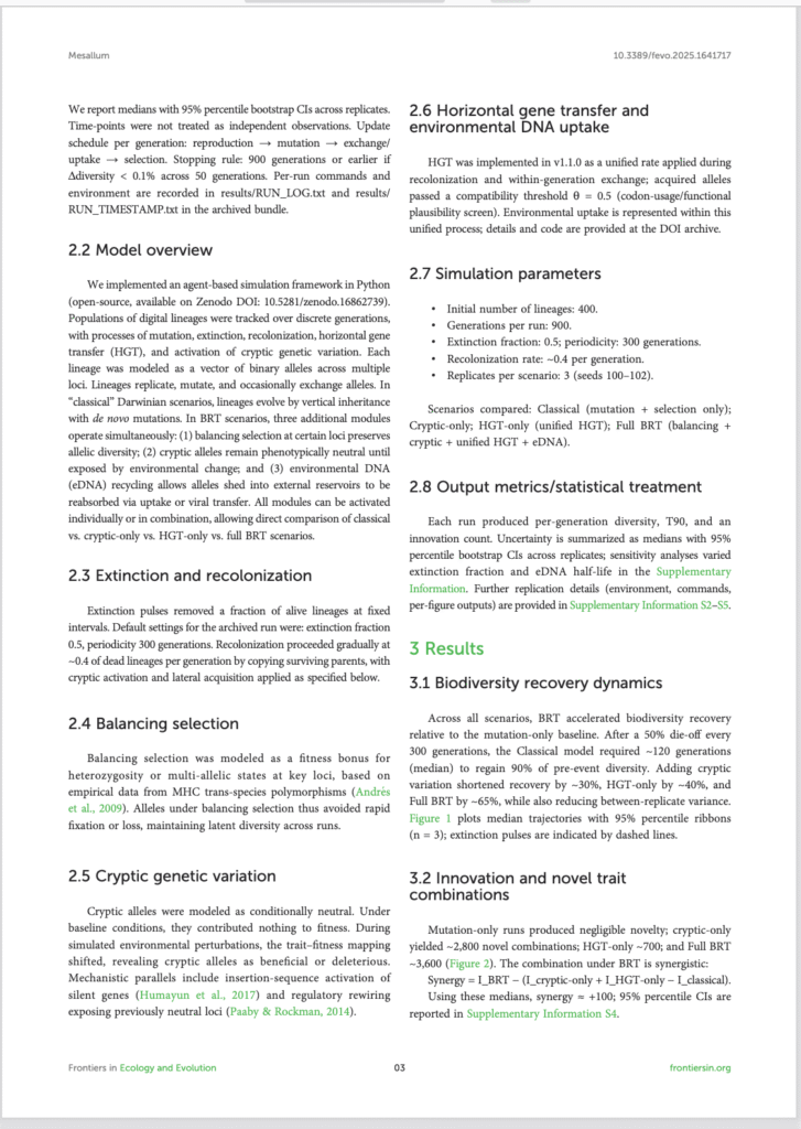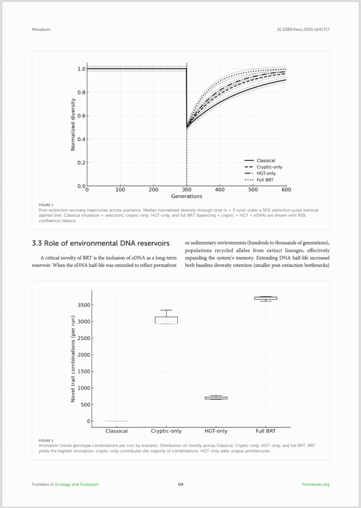 باختصار، يدمج BRT رؤى الشبكات مع آليات تجريبية — الاختيار التوازني، والأليلات الكامنة، و eDNA/HGT البيئي — لشرح كيف يسرّع إعادة تدوير الأليلات التعافي بعد الانقراض ويوسّع مساحة البحث الجيني بما يتجاوز الانحدار الرأسي وحده.