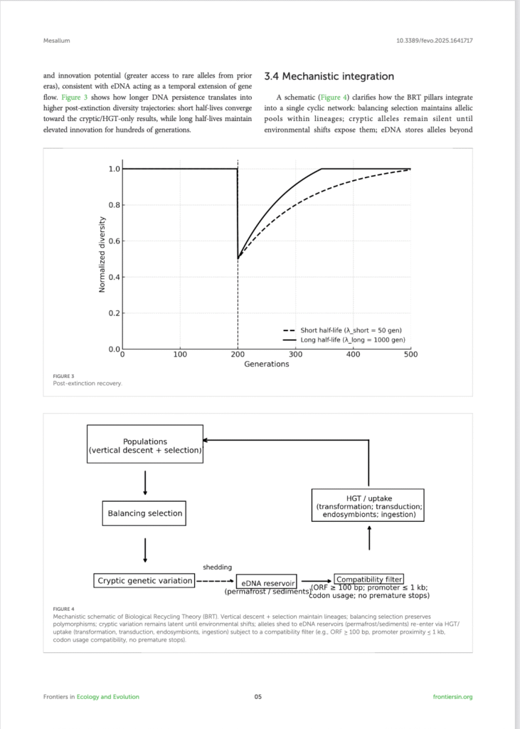 تدمج نظرية BRT بين الانتقاء الموازن، التنوع الجيني الكامن، وإعادة تدوير الجينات عبر النقل الأفقي والـeDNA لتوسيع “مساحة البحث الجيني” الفعّالة عبر الزمن.