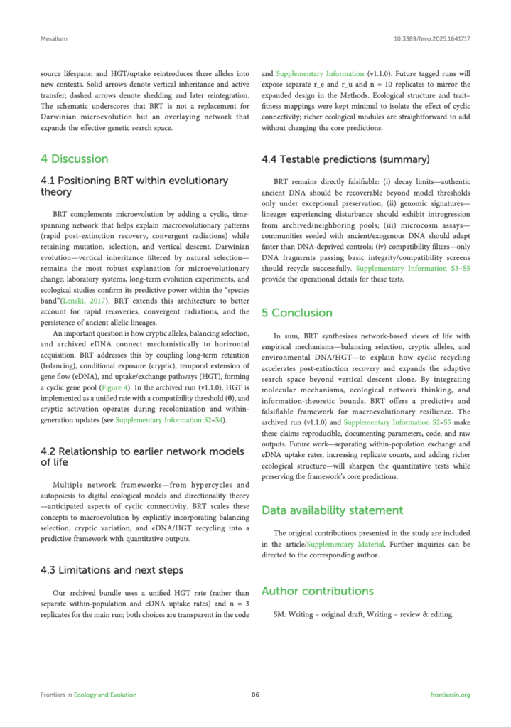 ما كان مفقودًا هو إطار يربط هذه المفاهيم الشبكية بإشارات تجريبية تتعلق بتعافي التنوع الحيوي، والتنوع الكامن، والحمض النووي البيئي. تعزز BRT هذا التكامل عبر ضم هذه العمليات في بنية دورية واحدة ذات تنبؤات قابلة للاختبار.